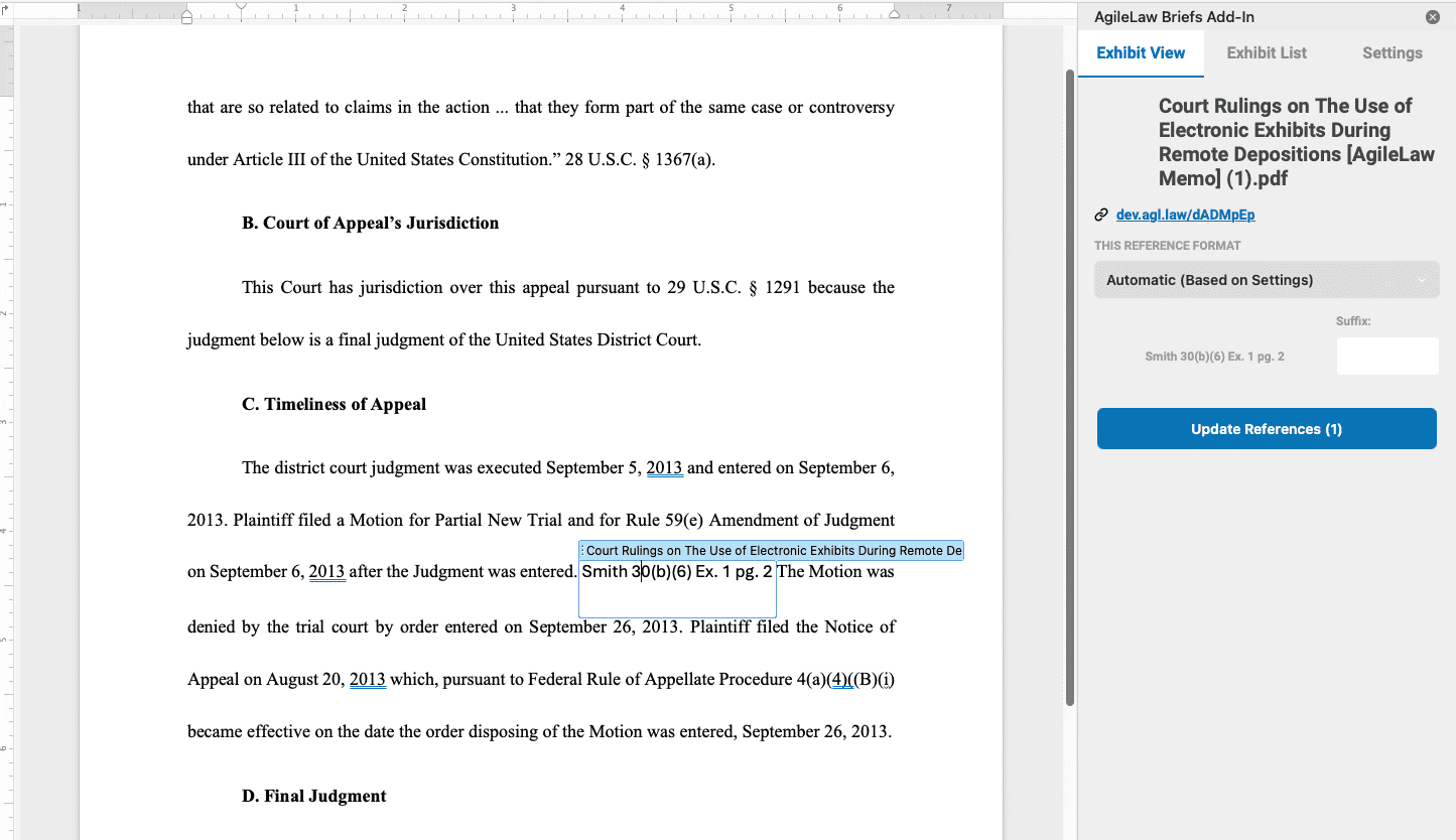 Save 2-3 hours per brief and eliminate errors by automating exhibit citations using AgileLaw's word add-in
